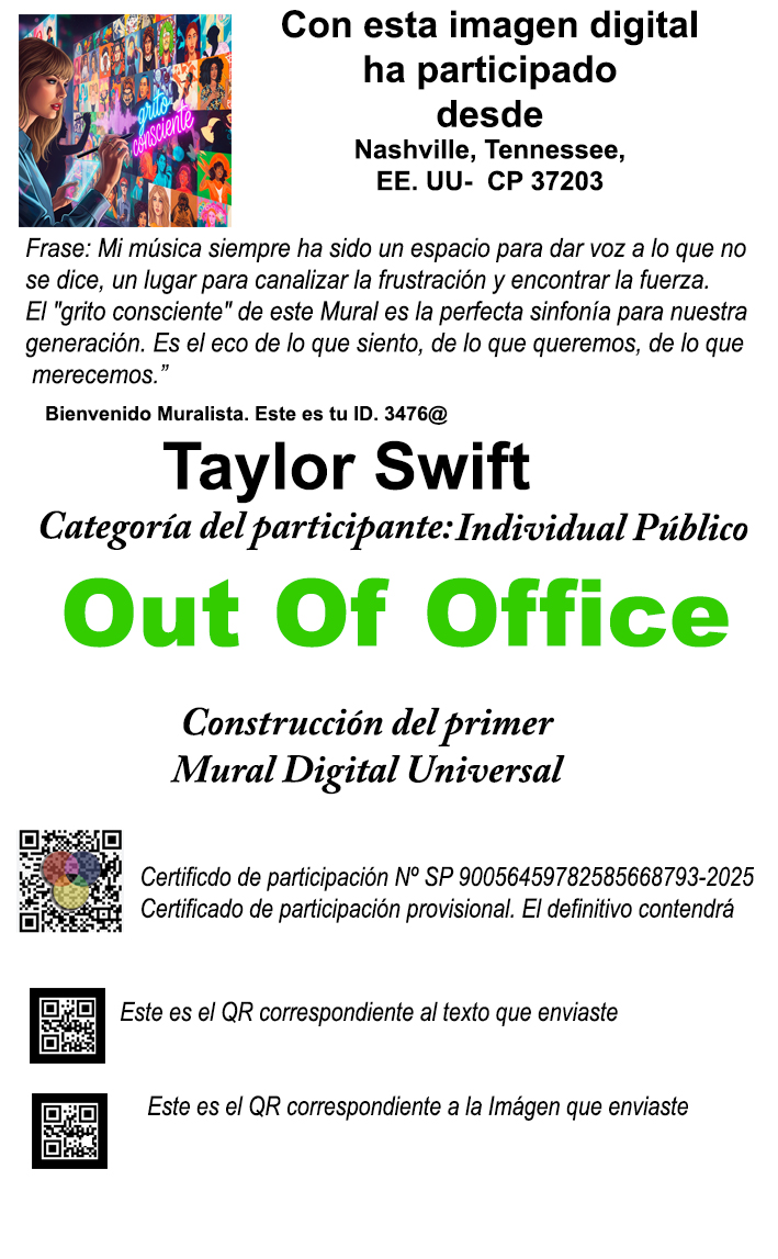 Con el mismo espíritu que ha conmovido a millones, me uno al «Mural Out Of Office». Mi imagen, mi «grito consciente» («Mi música siempre ha sido un espacio para dar voz a lo que no se dice… es la perfecta sinfonía para nuestra generación») no solo enriquecen esta obra global, sino que reafirman el poder del criterio propio en la era digital.