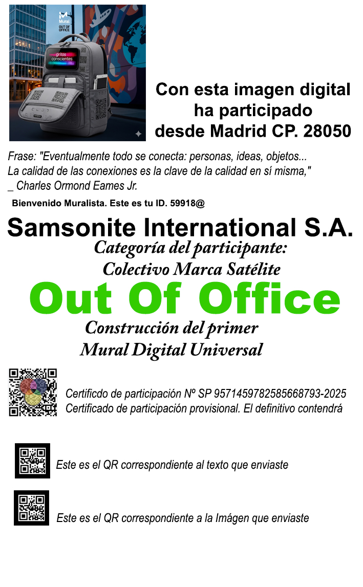 - Tecnología y Sinergias: Samsonite se ha unido a marcas líderes de smartphones para que, con solo un toque, la mochila y el dispositivo emitan los QR necesarios para que las imágenes del Mural sean amplificadas en los plasmas gigantes de los eventos. Esta funcionalidad convierte la mochila en una extensión tangible del «grito consciente» del usuario.