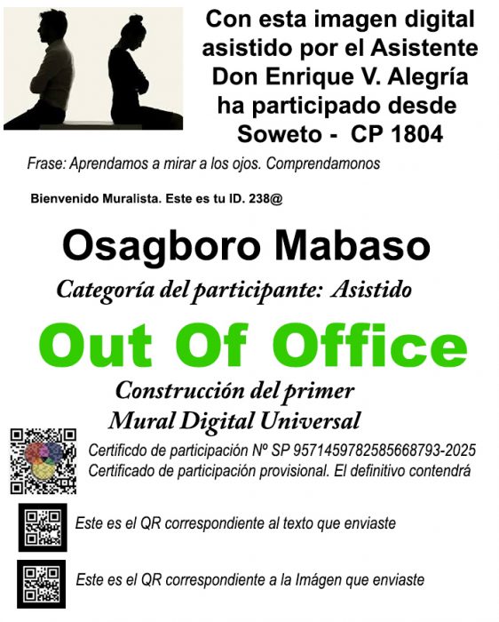 La imagen que tienes en tus manos no es solo un documento, es la materialización de tu aporte y tu identidad en el proyecto Mural Out Of Office. Este Certificado de Participación es tu garantía de que tu «grito consciente» quedará registrado para siempre en la historia del Mural Digital Universal.