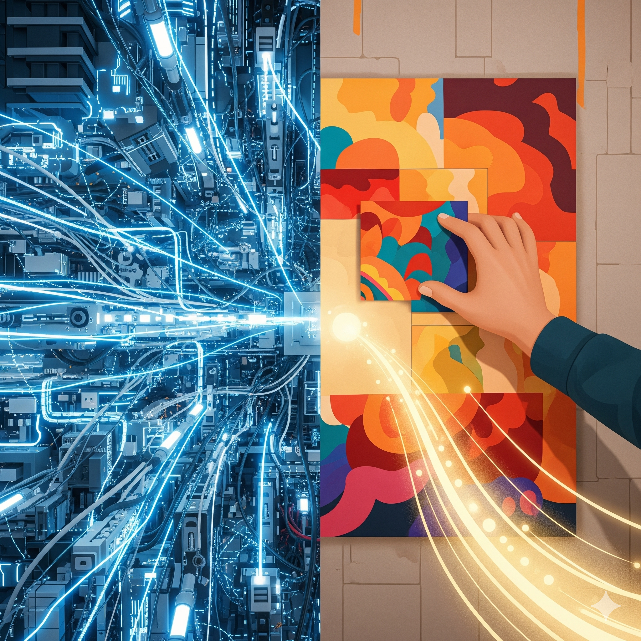 - Los tres colores primarios (Rojo, Azul, Amarillo): Cada uno simboliza un pilar fundamental: la pasión y la energía humana (rojo), la tecnología (azul) y la creatividad (amarillo). Estos elementos existen por sí mismos, pero su verdadero poder se manifiesta al unirse.