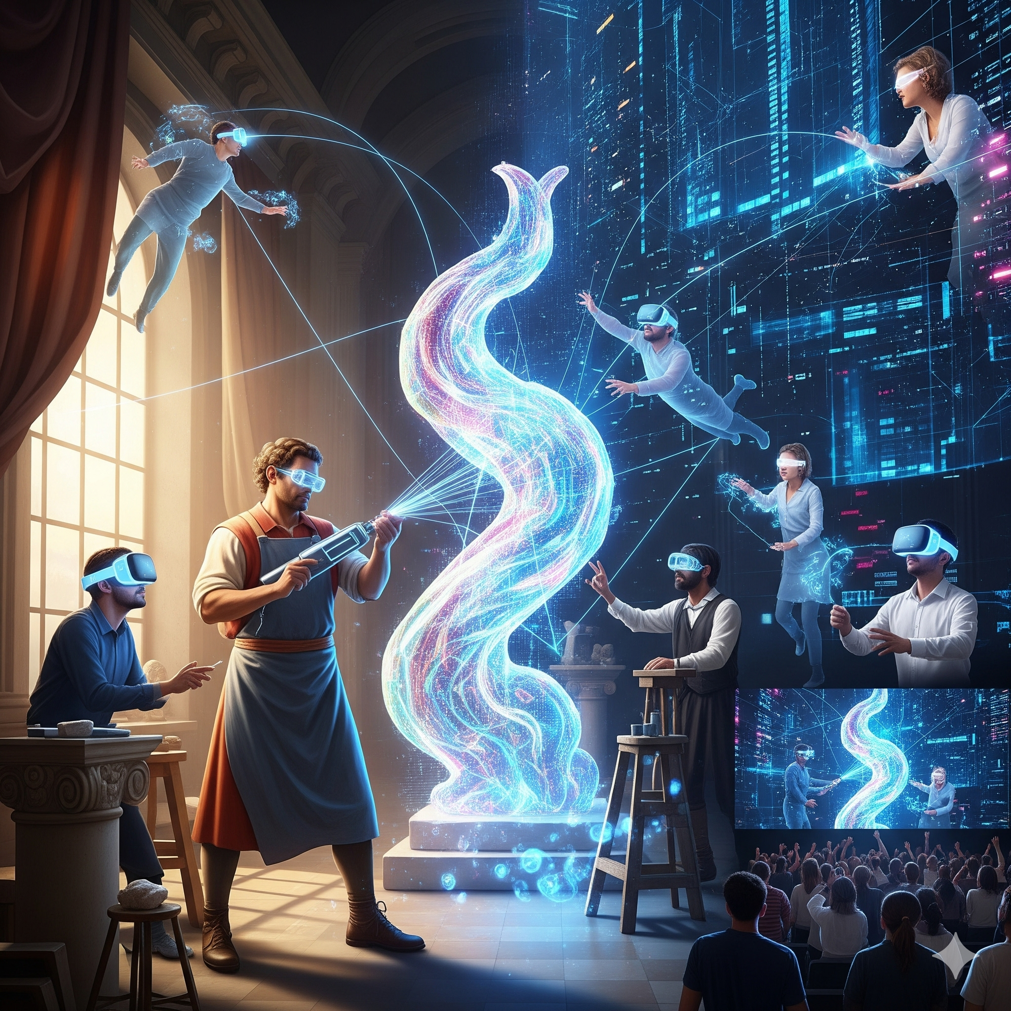 Imagina un espacio donde la historia y el futuro se fusionan: el avatar de Miguel Ángel esculpiendo en tiempo real, junto a los Muralistas que acceden al espacio virtual con sus gafas especiales, otros que participan desde el evento en vivo, y Muralistas de cualquier rincón del mundo conectados por internet. Todos, simultáneamente, dan forma a una creación única.