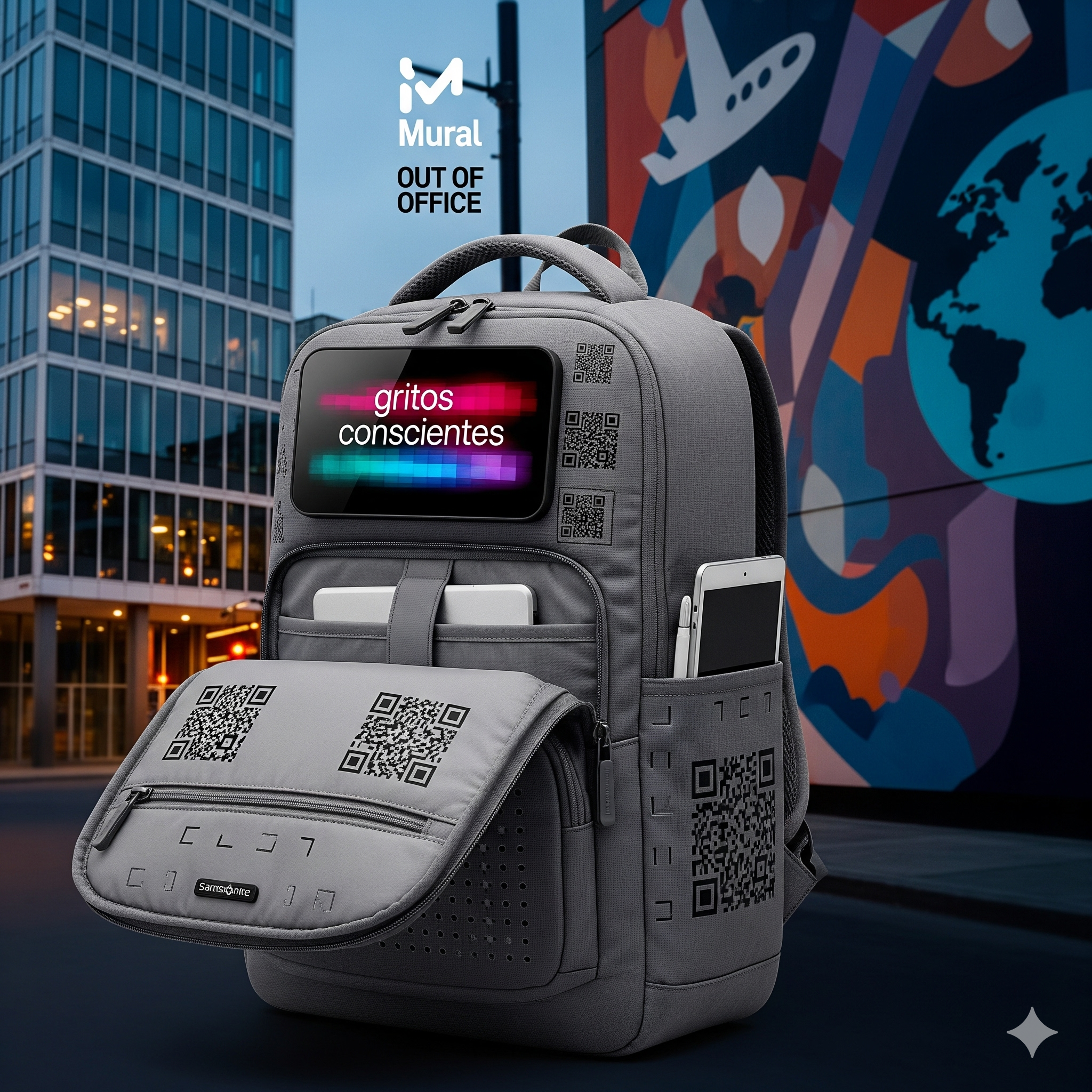 La mochila de Samsonite adaptada para el proyecto «Mural Out Of Office» es un ejemplo clave de una «marca satélite». No es una simple colaboración, sino una sinergia tecnológica y filosófica: